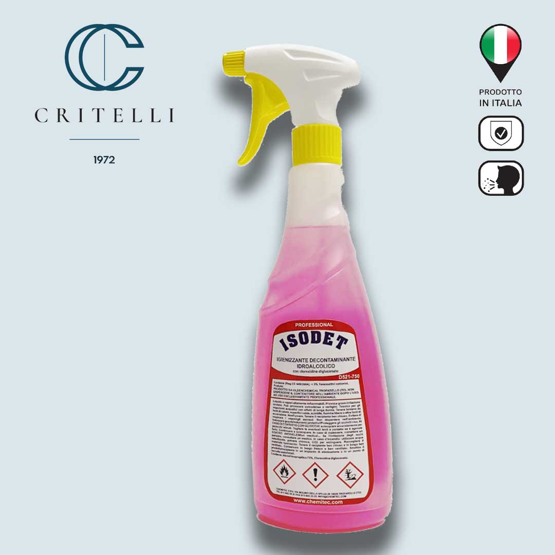 Disinfettante Alcolico 75% Indicato per la Pulizia e Disinfezione da Batteri Germi e Virus di tutte le Superfici Lavabili ISODET Spruzzatore 750 ml