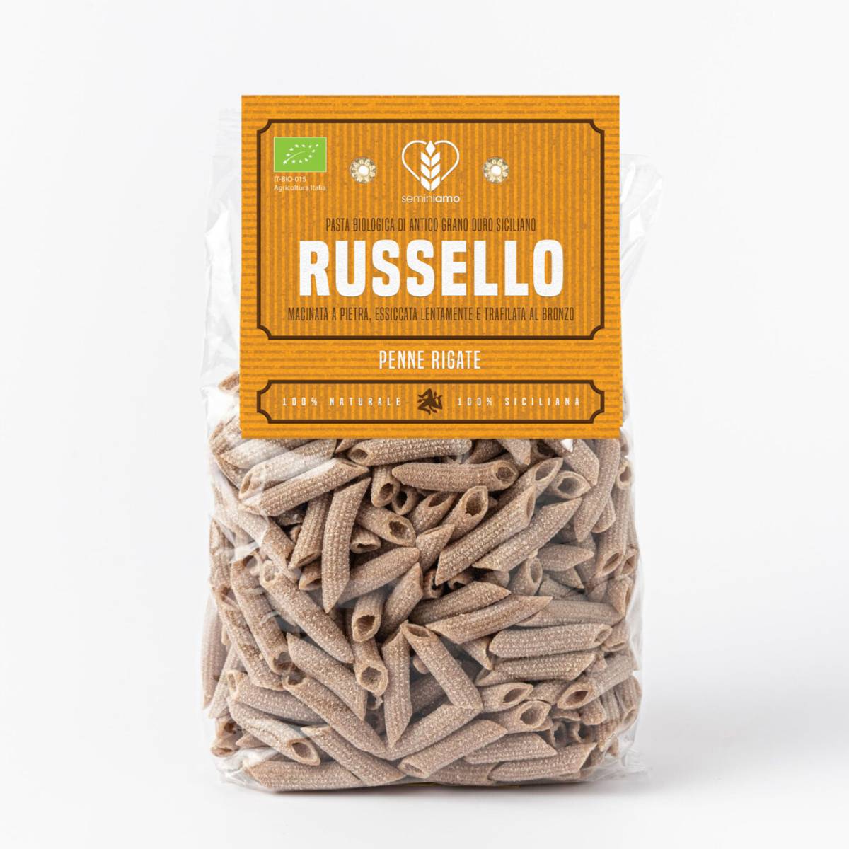 Pasta di grano duro antico 100% siciliano Russello macinata a pietra naturale, trafilata al bronzo ed essiccata lentamente a basse temperature.